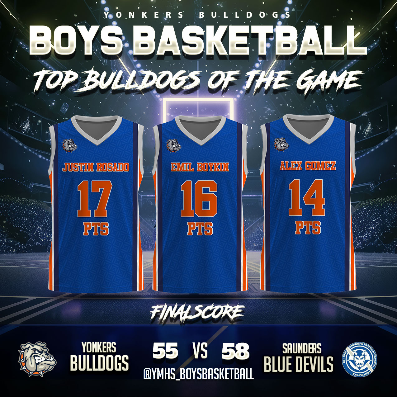 Despite the challenges, the Bulldogs’ core contributors continued to compete. Justin Rosado led all Yonkers scorers with 17 points, once again demonstrating his consistency and ability to generate offense. Emil Boylein followed closely with 16 points, while senior Alex Gomez added 14 points, providing a steady presence throughout the contest.
