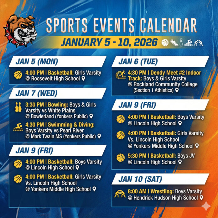 Welcome to the first full week of January competition! The winter season is in full swing, and our student-athletes have a busy schedule ahead. From the hardwood to the wrestling mats, here is where you can catch Bulldogs and Yonkers teams in action this week. (Games are subject to cancelations and changes, check before heading out!)